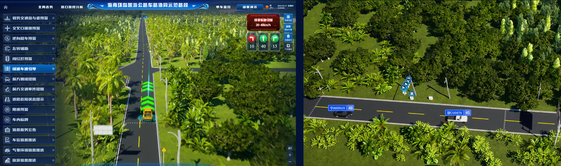 云控中心基于全域感知能力,助力管理者实现公路交通管控由事后处置向事前主动预防、事中高效调度转变。在路网监测方面,宏观掌握全省交通、旅游基本情况,针对重点路段、景点建构流量预测模型,指导重大节点交通保障工作。在车辆监管方面,自动为重点车辆建立数字档案,依托AI模型对故意遮挡号牌、违规上路等进行智能识别与轨迹追溯。在车路协同方面,目前已实现博鳌示范段的动态感知与数字孪生展示。